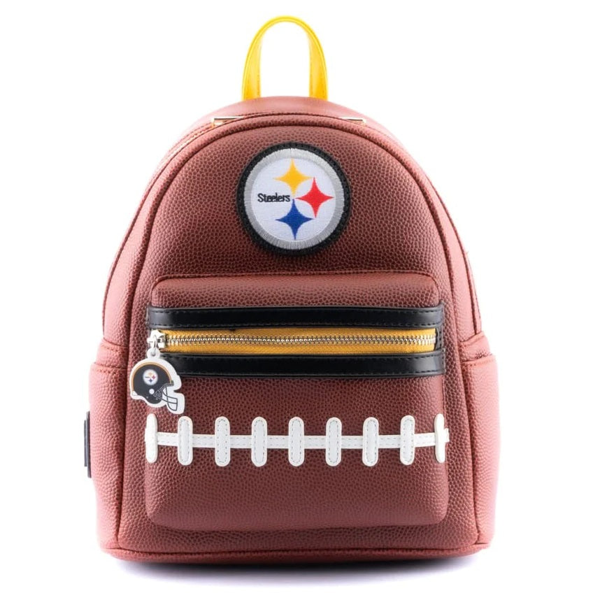This Pittsburgh Steelers pigskin mini backpack is a touchdown for any Steelers fan. The mini backpack is textured to mimic a football and features an embroidered patch of the team name on the front. It’s perfect for carrying everything you need to and from games. The bag has adjustable shoulder straps, sturdy metal hardware, and features: applique, embroidered patch, and rubber zipper charm details. Take note of the coordinating pattern of the inside lining fabric.